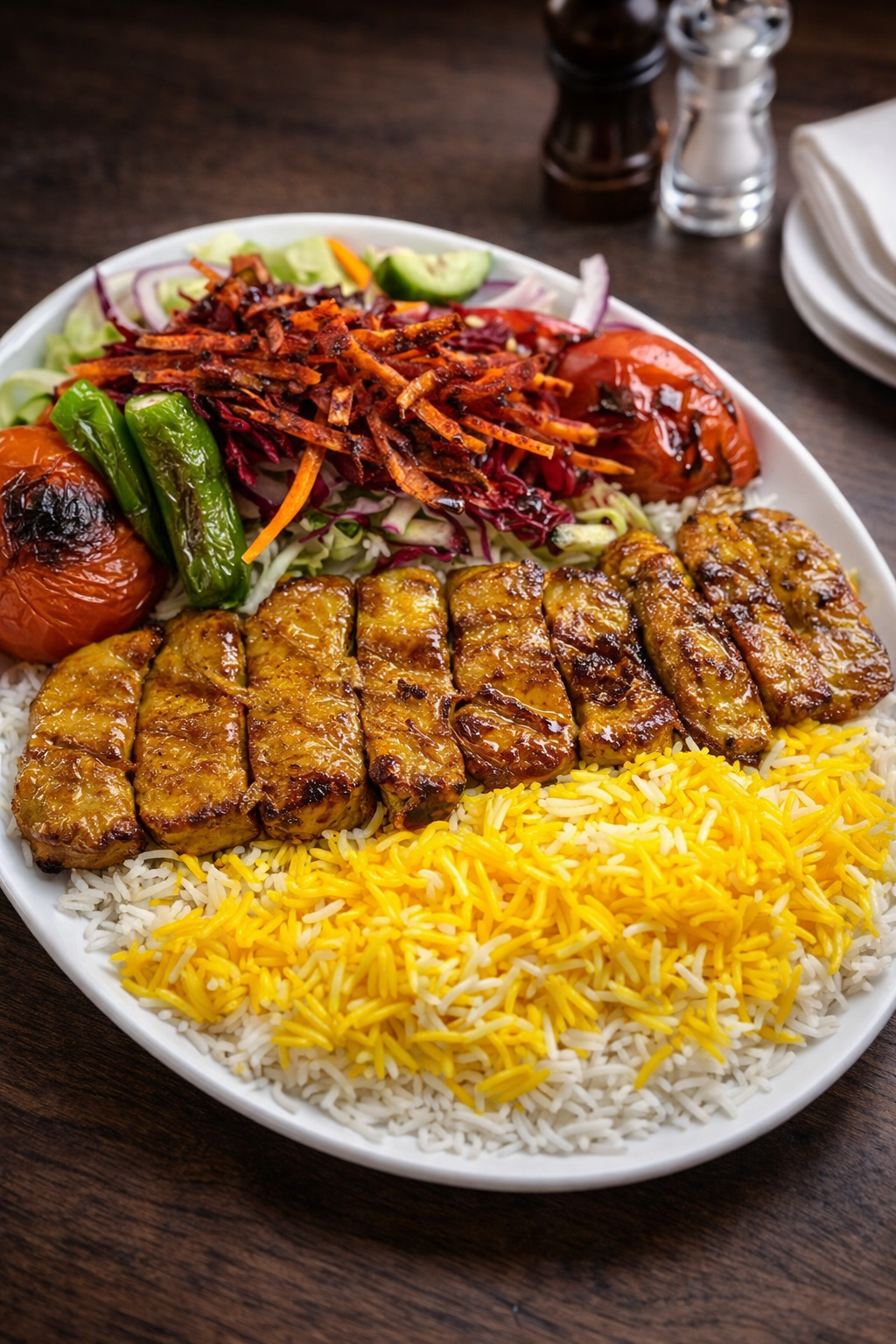 Our kebabs include tender chicken, lamb and classic Kubideh wrapped in warm, freshly baked Taftoon bread, finished with your choice of fresh salad and house sauces.